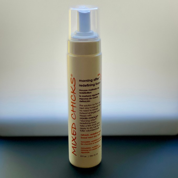 Let’s start with Mixed Chicks Morning After Foam. I love it! I’m a lazy low maintenance gal with high maintenance shopping habits and this stuff just goes straight into my day-old (or four day-old) hair with no re-wetting and no other products necessary. I just use prayer hands to put it on, scrunch it in, and my bed head hair is revived. Done!